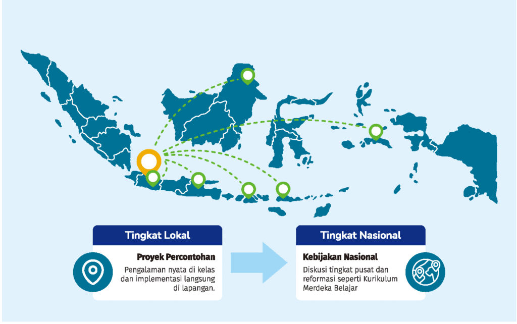 Kekuatan INOVASI terletak pada kemampuannya untuk menghubungkan inovasi akar rumput dengan kebijakan nasional. Bukti yang dikumpulkan dari proyek percontohan secara langsung mempengaruhi diskusi di tingkat pusat, membantu membentuk reformasi signifikan seperti kurikulum Merdeka Belajar. Pertukaran dua arah ini memastikan bahwa kebijakan tidak hanya berdasarkan rekomendasi ahli tetapi juga berakar pada pengalaman ruang kelas yang nyata. Ini adalah model dinamis di mana kemenangan lokal membantu membangun momentum nasional.