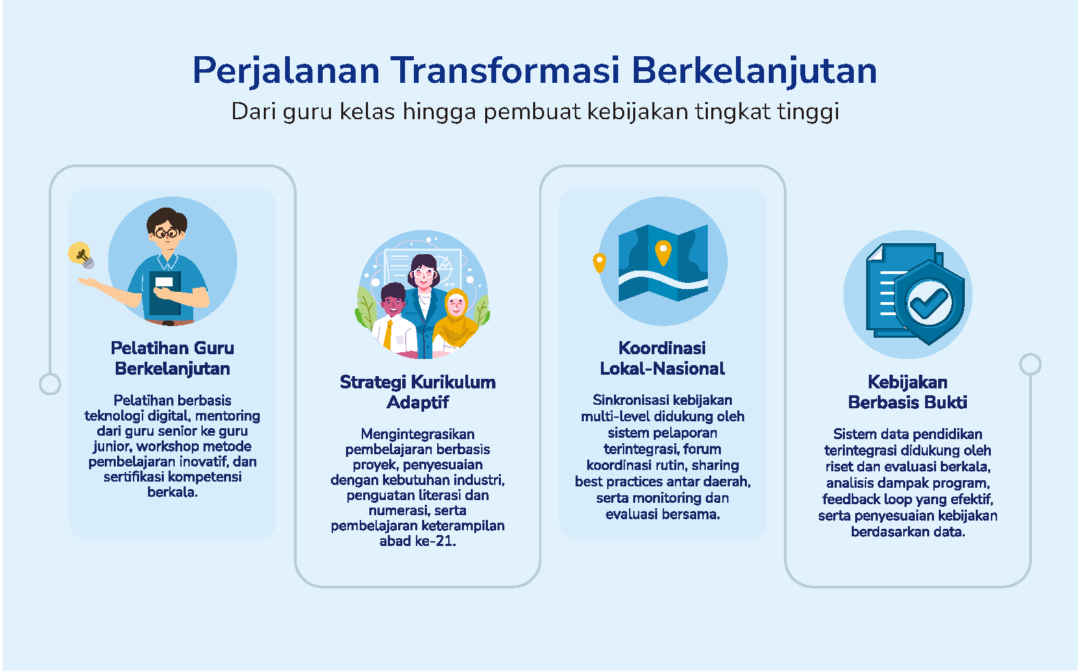 Pengembangan guru berkelanjutan, kepemimpinan yang kuat, dan kurikulum yang konsisten, selaras, dan fleksibel dapat mengubah lingkungan belajar dan menciptakan perubahan yang bertahan lama.