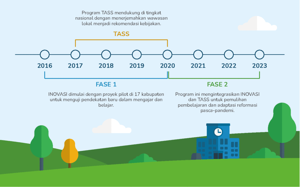 Menghadapi tantangan yang tidak terduga – termasuk pandemi COVID-19 – program ini berkembang dengan mengintegrasikan kekuatan dari INOVASI dan TASS. Fase ini ditandai dengan fokus pada pemulihan pembelajaran dan adaptasi reformasi untuk memenuhi kebutuhan sekolah dan komunitas yang berubah. Dalam Fase I, INOVASI bertujuan untuk ‘menemukan apa yang berhasil’ di sekolah dan ruang kelas. Dalam Fase II, pelajaran dari Fase I digunakan untuk menginformasikan kebijakan nasional.